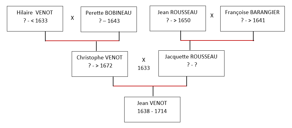 Grâce à ces différentes sources et grâce à Clovis17, j’ai pu remonter assez facilement. Jean VENOT né à Saint-Hilaire-de-Voust est le fils de Christophe VENOT, marchand, et de Jacquette ROUSSEAU, son épouse. Ce couple a eu entre 1634 et 1649 huit enfants dont Jean mais aussi une fille prénommée Jacquette, comme la sœur avérée de mon sosa. Mais cela ne fait toujours pas preuve pour moi. Le contrat de mariage des parents, le 26 mai 1633 à Saint-Hilaire-de-Voust chez Me JOURNOLLEAU, donne les quatre grands-parents de mon possible ancêtre : Hilaire VENOT et Perette BOBINEAU d’une part, Jean ROUSSEAU et Françoise BARANGIER de l’autre. Une fois cette structure établie, j’ai poursuivi mes recherches sur la famille élargie : frères et sœurs, oncles et tantes, cousins et cousines de Jean VENOT. J’ai découvert des notables locaux, marchands ou notaires, propriétaires de fermes, sachant signer pour beaucoup, pratiquant l’endogamie, unis familialement et économiquement. Mais je n’ai rien trouvé parmi les nombreux actes (mariages, contrats de mariages, baptêmes ou sépultures) prouvant que le fils de Christophe VENOT et de Jacquette ROUSSEAU soit mon ancêtre.