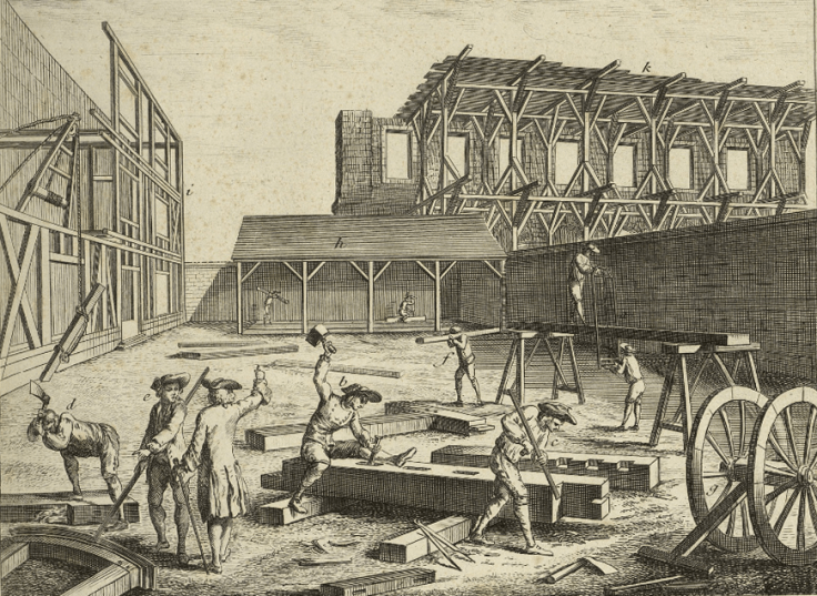 CHARPENTIER : ouvrier qui a le droit par lui-même de faire ou de faire exécuter tous les ouvrages en gros bois qui entrent dans la construction des édifices, les machines, telles que les grues & autres, &c. en qualité de membre de la communauté des Charpentiers.