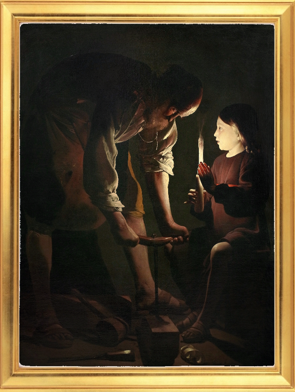 Pour connaître la réalité du métier de charpentier au XVIIIe siècle, là encore, je préfère regarder un tableau que l’illustration de l’Encyclopédie. Je doute que mes 2 demi-frères ancêtres aient bâti des charpentes aussi importantes et je doute aussi qu’ils aient eu autant de personnel pour les aider. Le tableau religieux de Georges de la Tour me semble plus indiqué pour rêver le travail de mes deux aïeux. Il représente saint Joseph, patron des charpentiers, que mes aïeux, fervents catholiques, vénéraient forcément. La pénombre du clair-obscur permet à mon imagination de vagabonder : plutôt que saint Joseph, c’est peut-être René FROUIN dans son atelier, qui perce une pièce de bois à l’aide d’une tarière, à moins que ce ne soit son demi-frère François FROUIN au milieu de ses outils qui jonchent le sol…