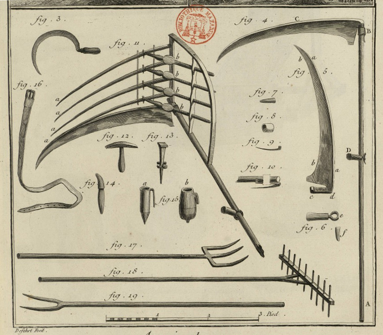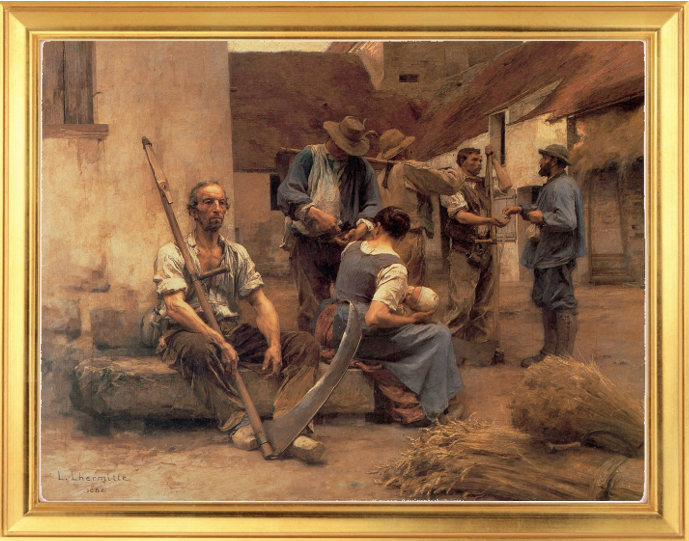 J’ai un vaste choix pour raconter un ancêtre direct journalier. L’Encyclopédie le dit, « cette espèce d’homme forme la plus grande partie d’une nation. » C’est aussi vrai pour mon arbre généalogique. Le gouvernement n’étant pas toujours bon, beaucoup de ces aïeux ont été misérables. J’ai également un vaste choix pour illustrer par une œuvre le métier de journalier. Le monde paysan a inspiré de nombreux artistes avec des visions différentes de la ruralité : naturaliste, réaliste, pastorale… Les frères LE NAIN ou Jean-François MILLET en sont des exemples reconnus à quelques siècles d’écart. Mon tableau préféré reste celui de Léon LHERMITTE, « La Paye des moissonneurs ». Je reconnais tous mes journaliers dans l’attitude épuisée et digne du moissonneur, assis sur son banc de pierre. Je vois entre ses jambes le dail (la faux) utilisé pour faucher les blés et à sa ceinture je devine la pierre à aiguiser. Sur le côté du tableau, la distribution de la paye rappelle les difficultés de leur statut précaire et saisonnier.