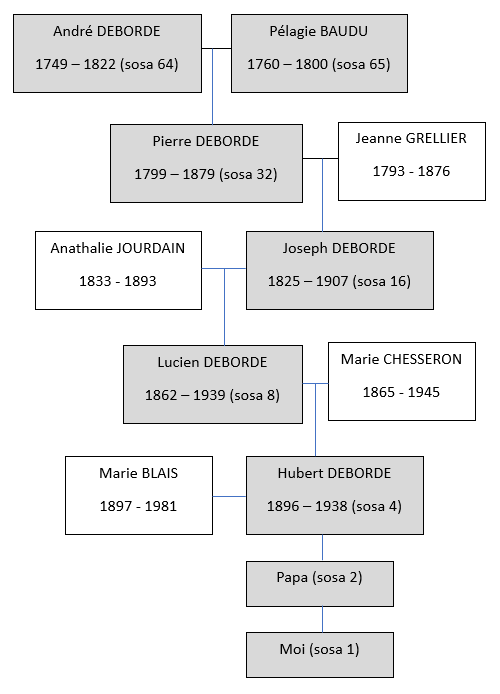 Dans ce cas, la seule solution serait une autre femme aïeule, Pélagie BAUDU (sosa 65). Cette fille de laboureurs (François BAUDU et Marie BOUREAU) s’unit en 1796 à Pugny avec un autre laboureur, André DEBORDE. Les époux ne sont pas bien jeunes : elle a 36 ans et lui 47 ans. La paix fragile au sortir de la guerre civile de Vendée autorise l’espoir de fonder une famille. Trois ans plus tard, ce vœu se concrétise avec la naissance de leur fils Pierre (sosa 32). Pélagie ne le verra malheureusement pas grandir bien longtemps. Elle meurt le 14 juillet 1800 à l’âge de 39 ans. André se remarie 4 ans plus tard avec Marie Rose TURPEAU qui l’aidera à élever son fils.