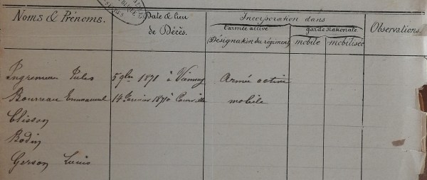 Trépasser chez les siens Pierre « Jules » INGREMEAU est né le 8 janvier 1850 à Viennay, fils de Pierre INGREMEAU, fermier, et de Virginie MOINE. Il a donc 20 ans en 1870, année de la conscription mais aussi de la déclaration de la guerre à la Prusse. Le jeune homme est cultivateur, il a les cheveux et... Lire la Suite →